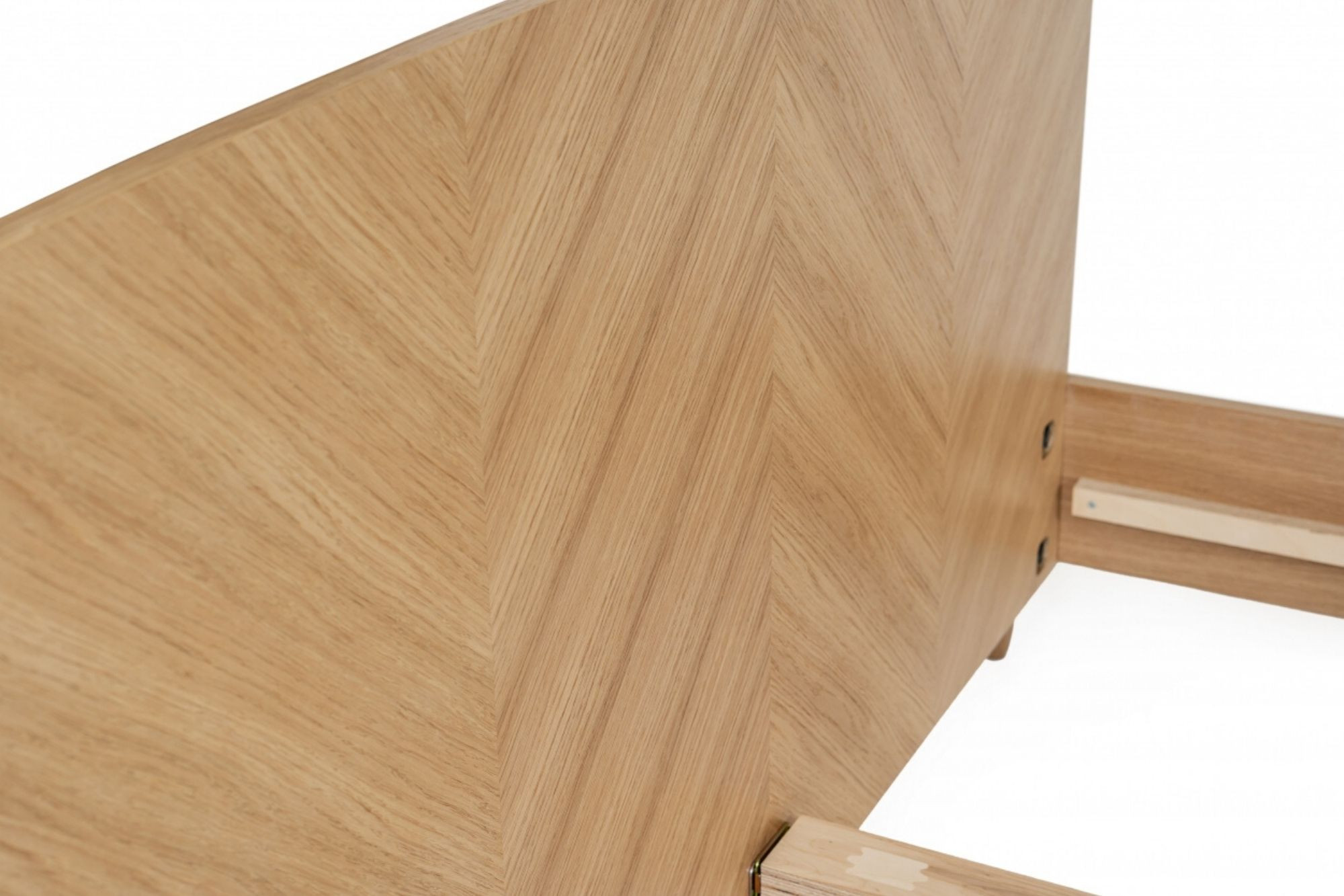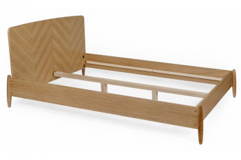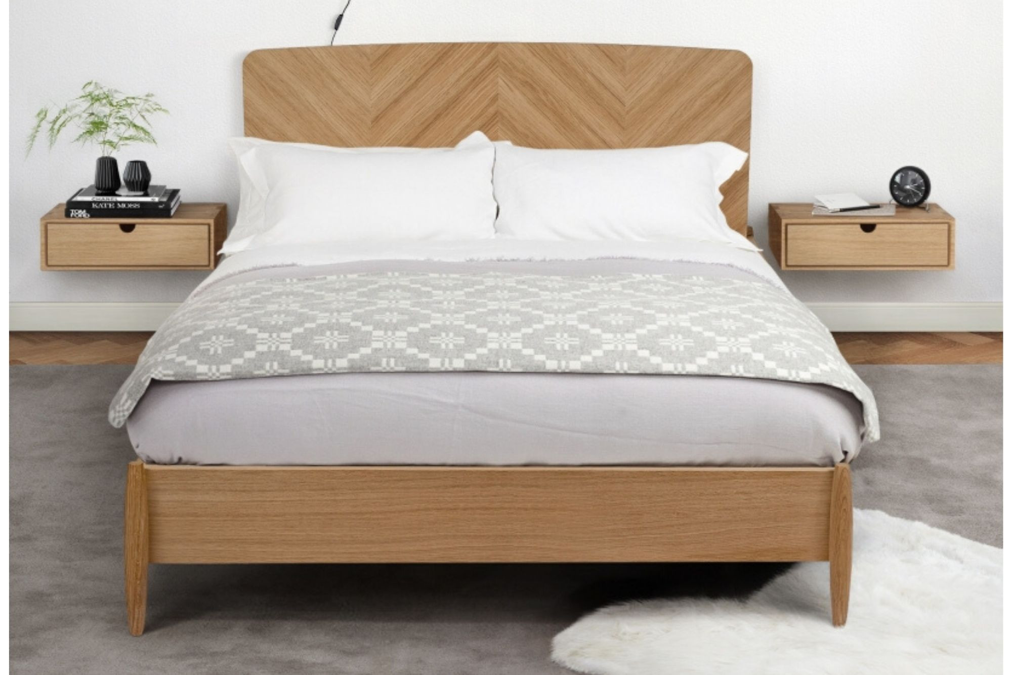 Réchauffez votre chambre à coucher avec ce lit en placage chêne marqueté. La tête de lit tout aux angles arrondis associée aux pieds ronds tournés en bois, lui donne un aspect moderne et accueillant . Le lit RIBE habille la chambre et apporte une ambiance chaude et apaisante.