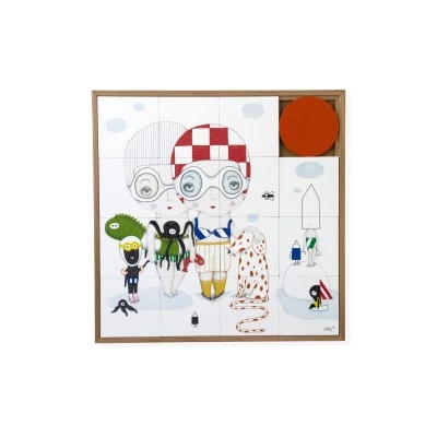 Taquin est un tableau qui met en valeur une illustration exclusive, imprimée sur des supports en bois. Ces palets indépendants sont soigneusement travaillés afin de s’assembler et de coulisser au centre d’un cadre en chêne massif. L’unique palet rond et orange, signature de la marque TAQUIN est la clef de votre imagination, positionné où bon vous semble, il se « tourne », se retire, se positionne et verrouille votre création du moment. Enfin, jusqu'à la prochaine fois, au gré de vos envies!