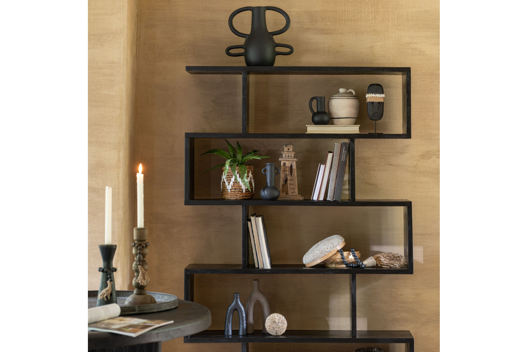 Deux finitions, un design unique : cette bibliothèque en manguier allie géométrie moderne et élégance naturelle pour sublimer vos objets du quotidien.