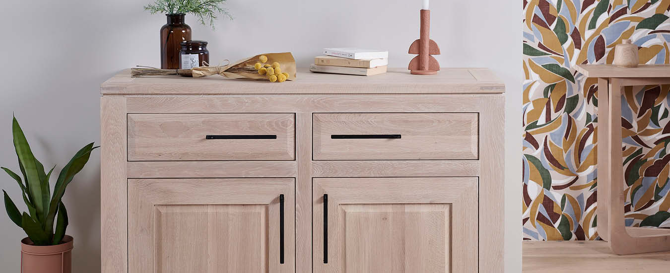 Contrastant avec la chaleur du bois massif naturel, la fine poignée métallique affirme sa personnalité et redessine le contour d'une collection de meubles contemporaine et durable.