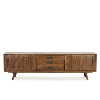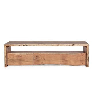 Assemblé en tenon/mortaise, ce meuble télé se distingue par sa modernité et originalité soulignées par la forme incurvée de la façade du tiroir et par le contraste de couleurs entre le bois naturelle et la poignée en métal noir.