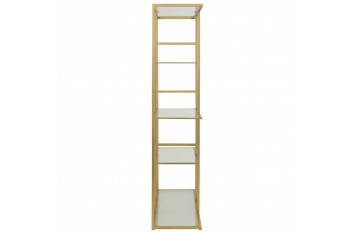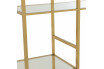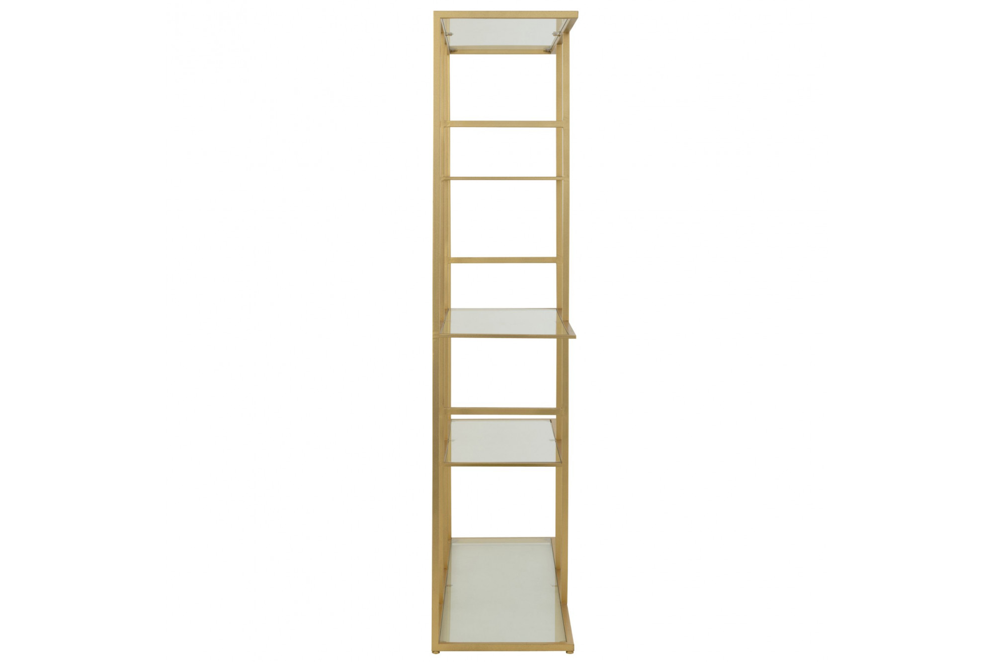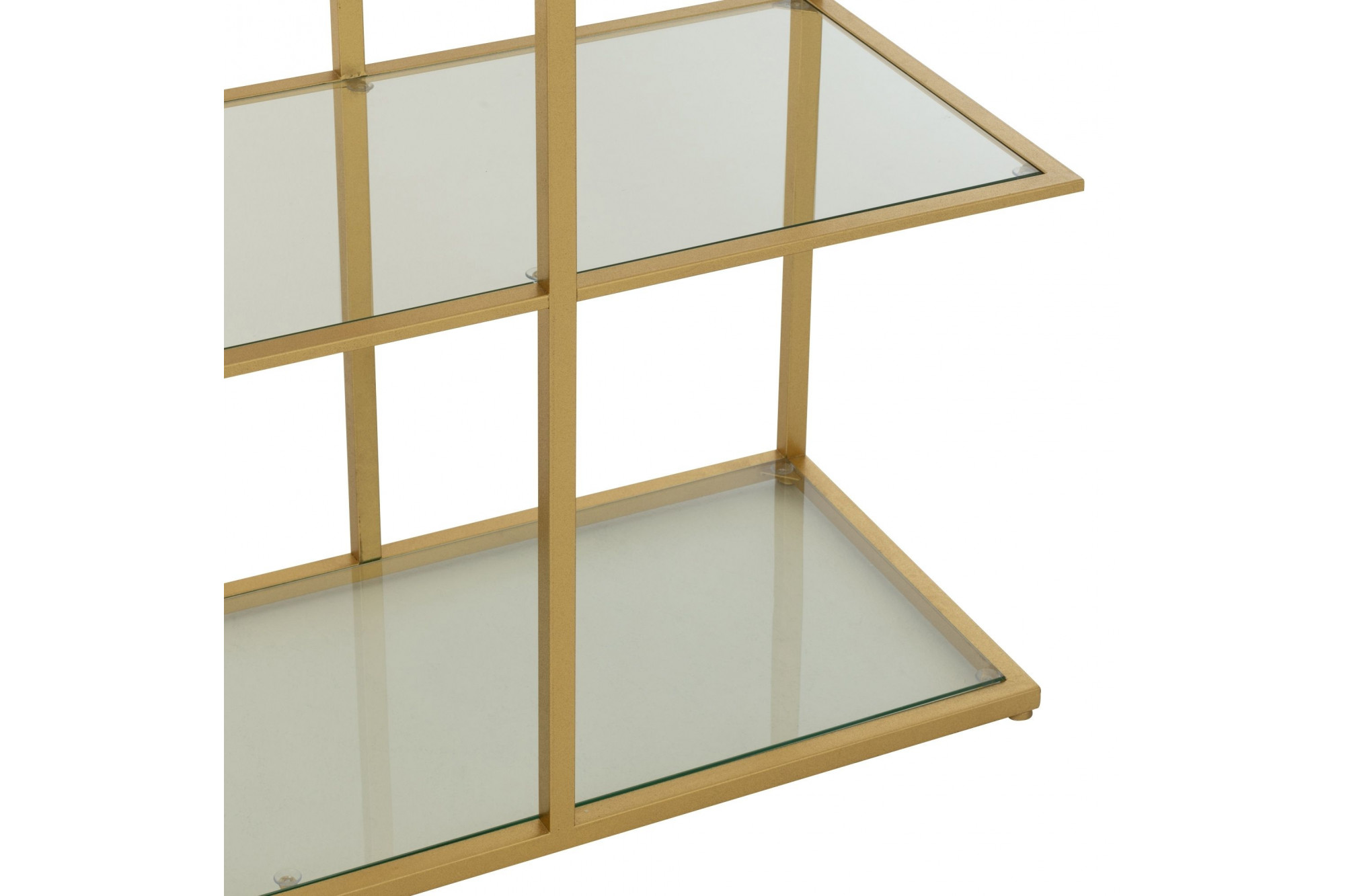 Étagère bibliothèque au cadre en métal doré et étagères en verre transparent, au design minimaliste et élégant, idéale pour exposer livres et objets dans un intérieur moderne.