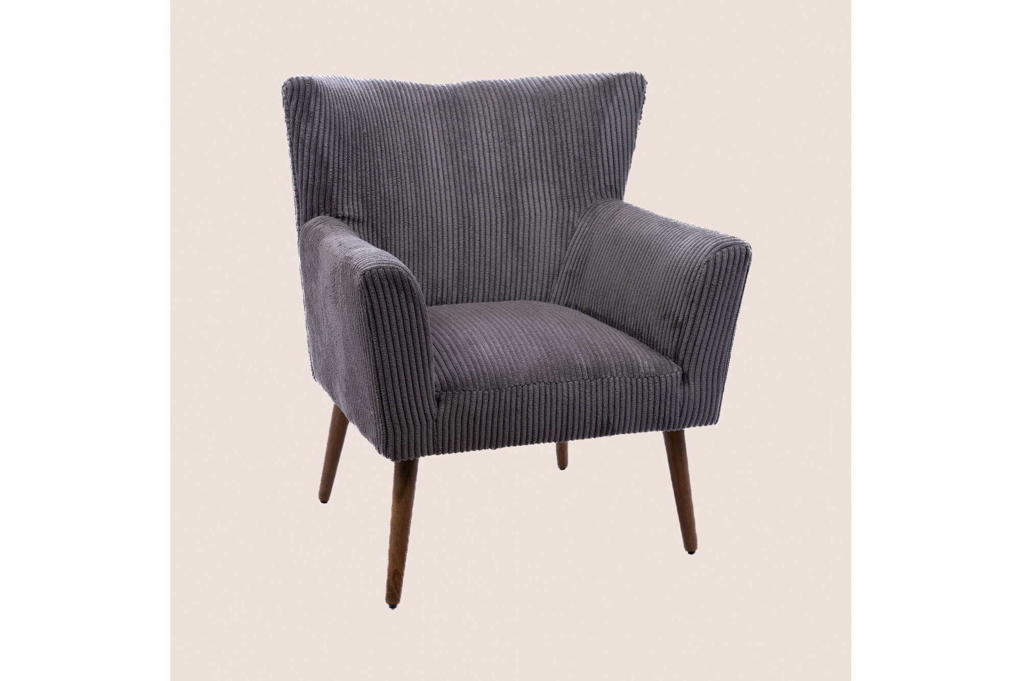 Fauteuil à accoudoirs en velours côtelé et piétement en bois. On s'y voit déjà, un verre à la main (de jus d'orange bien sur), un livre dans l'autre et un fond musical pour nous relaxer après une journée de travail.