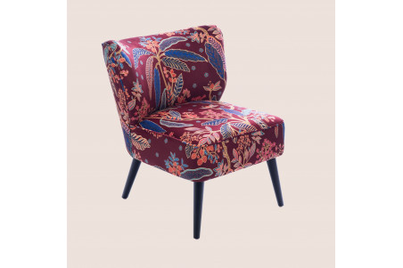 Ce fauteuil au dossier coquille, légèrement enveloppant et revêtu d'un tissu d'ameublement français au motif floral et aux tons très actuels, dans les nuances de violet, prune, bordeaux et camaïeux de bleu.