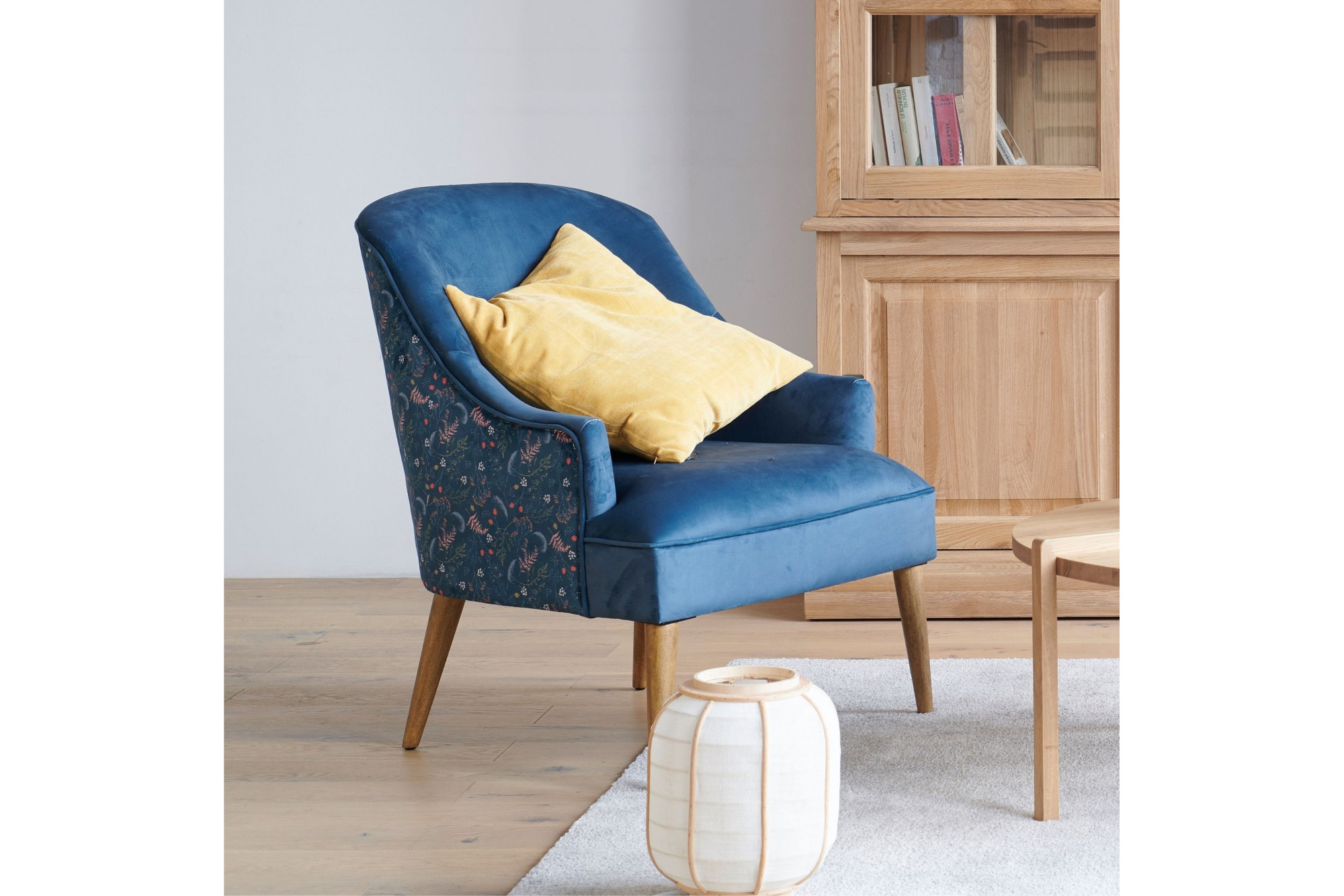 Reposant sur quatre pieds en bois légèrement inclinés d'une hauteur de 26 cm, ce fauteuil apportera du charme et de la chaleur à votre salon, chambre ou entrée.