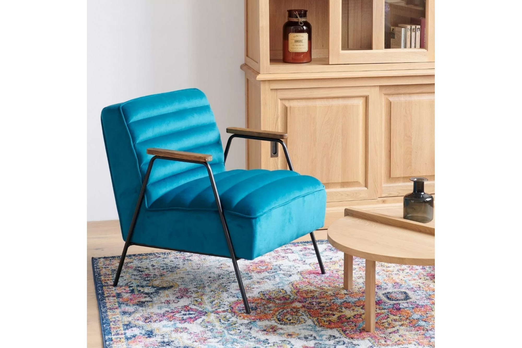 Le fauteuil LISBOA repose sur une structure métallique finition noir. Les pieds légèrement inclinés, les accoudoirs en bois et le revêtement velours dans des teintes colorés apportent à ce fauteuil un charme inégalable.