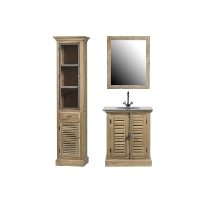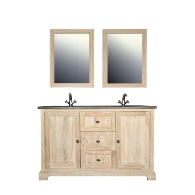 Cet ensemble se compose d'un meuble de salle de bain 100% en chêne massif blanchi, avec son plan en pierre naturelle bleue et sa vasque en céramique.