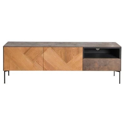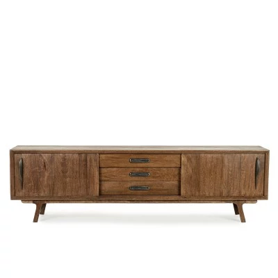 Le meuble TV au design épuré associe parfaitement le bois de manguier et le métal. Il se distingue par le travail de ses portes qui donne l'illusion d'un bois en relief.