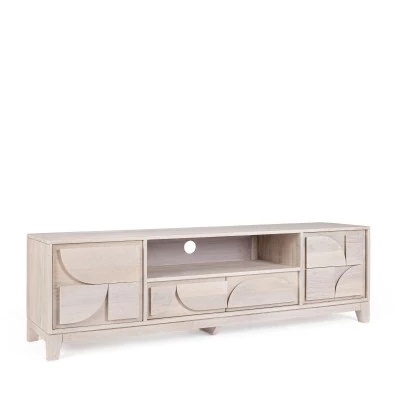 Meuble TV bas en chêne moyen équipé de deux portes et deux niches ouvertes.
