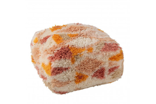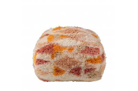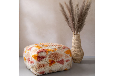 Pouf ethnique en laine à poil haut, multicolore et chaleureux, idéal comme assise ou repose-pieds pour sublimer tout intérieur avec une touche artisanale.