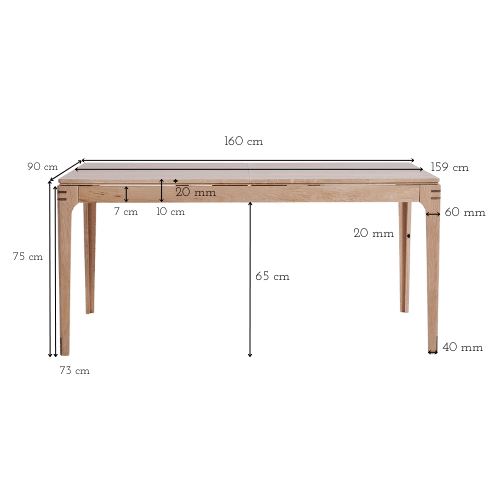 Table à manger rectangulaire extensible BONIE de 156 cm en chêne clair avec deux allonges centrales de 37 cm.