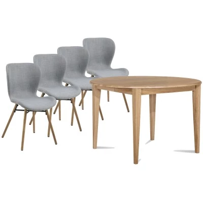 Table rectangulaire extensible en chêne clair 160 cm et 4 chaises Matilda en tissu.
