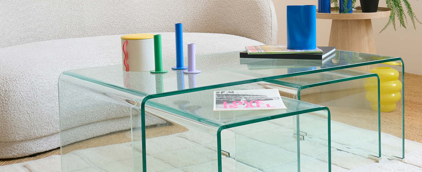 Les tables basses gigognes IDORA en verre trempé destinées à un intérieur contemporain.