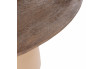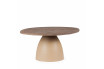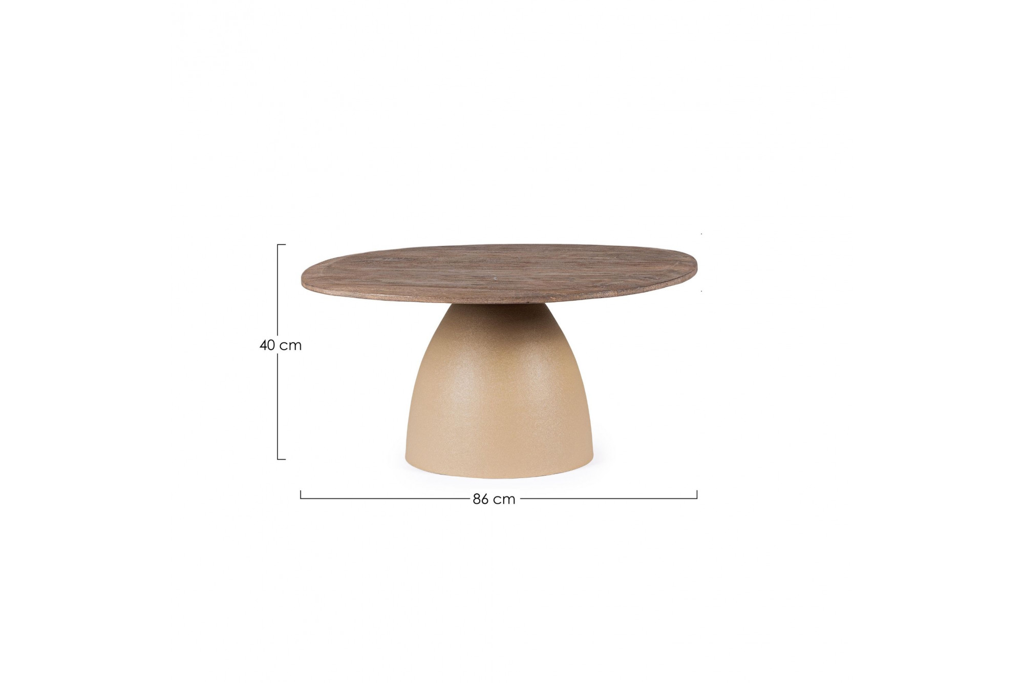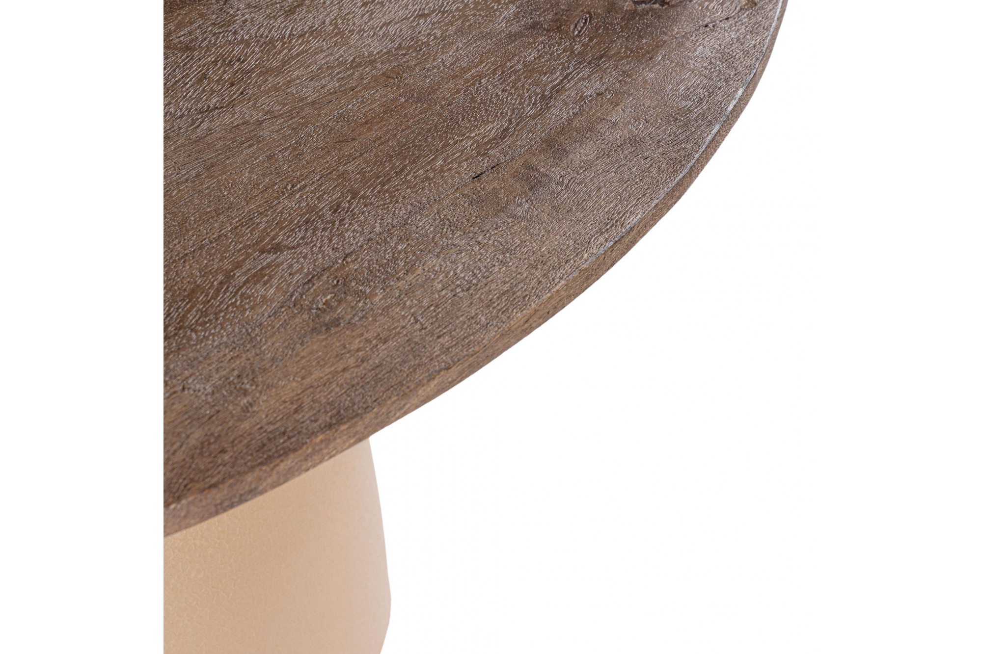Son plateau en bois massif met en valeur la texture authentique du manguier, une essence de bois noble et chaleureuse, tandis que son pied circulaire en métal beige assure une stabilité solide et une présence graphique. L’alliance du bois massif et du métal crée un contraste harmonieux entre matière brute et modernité.