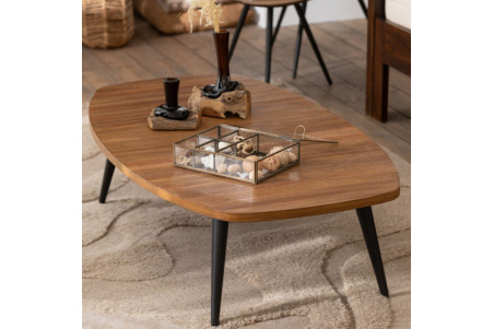 La table basse de salon ovale en teck recyclé et métal texturé allie modernité et élégance.
