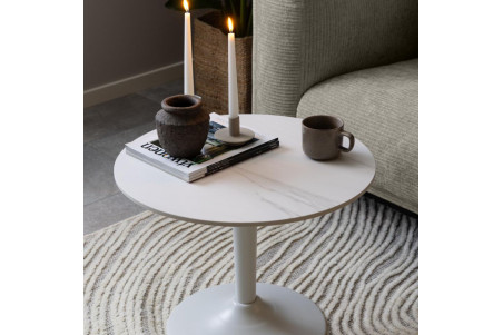 Table basse ronde de 60 cm de diamètre avec plateau en céramique et pied métallique de forme tulipe au coloris assorti.
