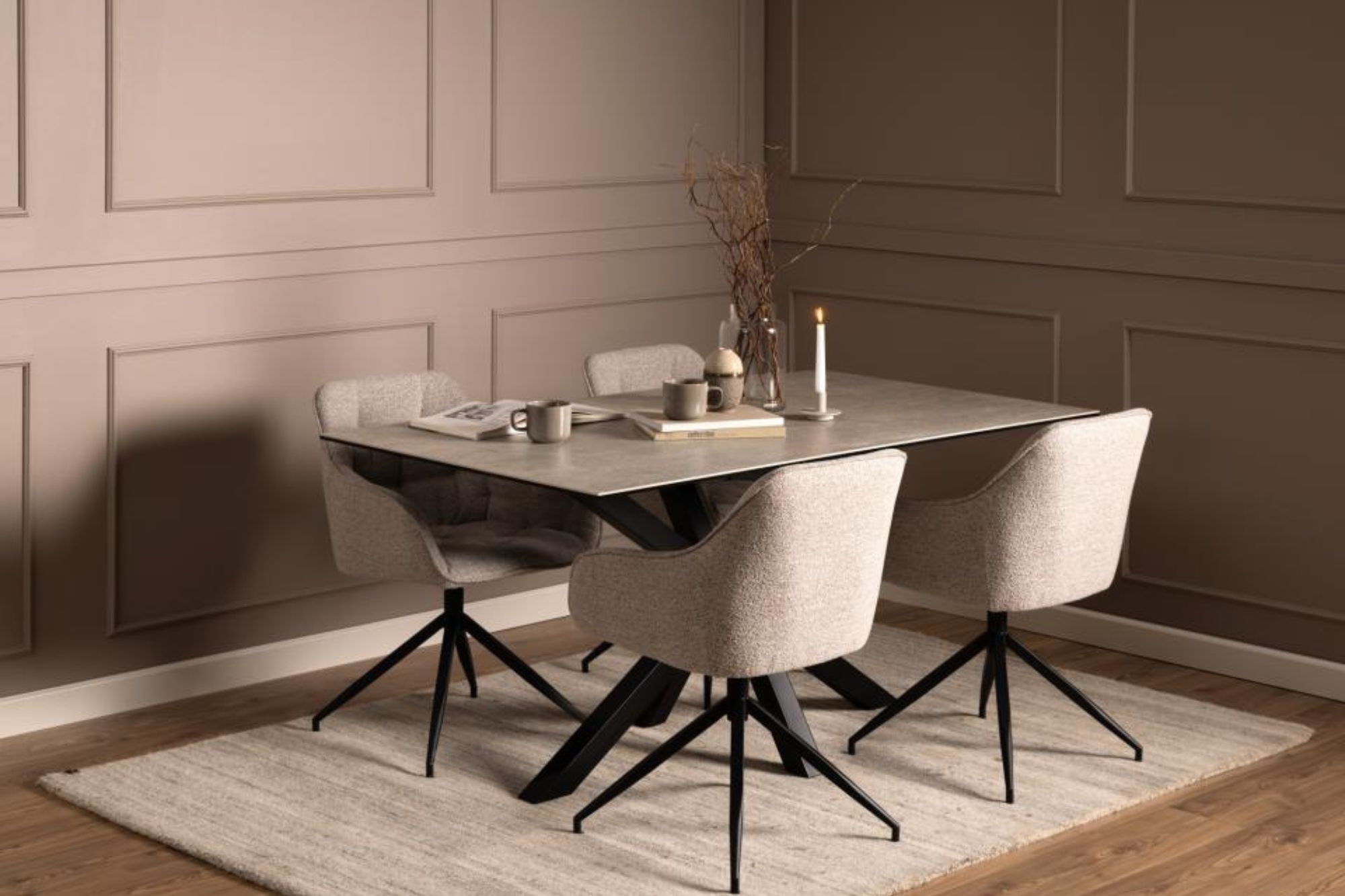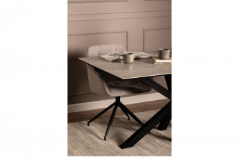 La table de salle à manger NEIVA de 160 cm de longueur associe des matériaux raffinés et solides.