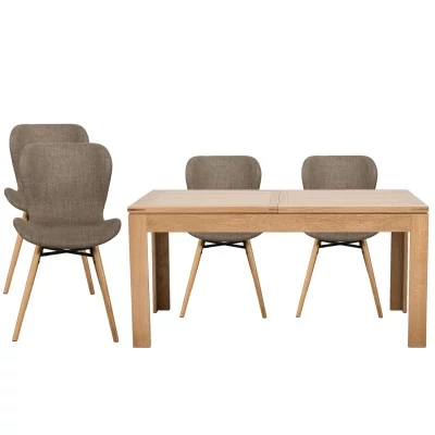 Table ronde 105cm en chêne massif avec ses 4 assises en tissu et piétement en chêne.