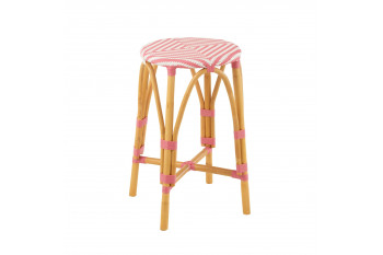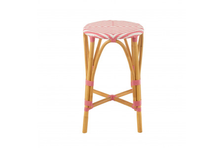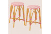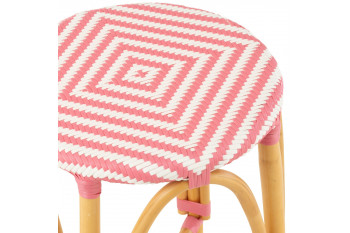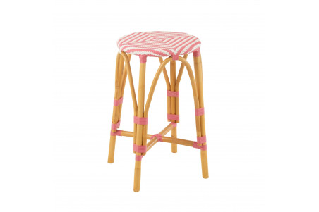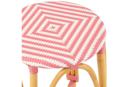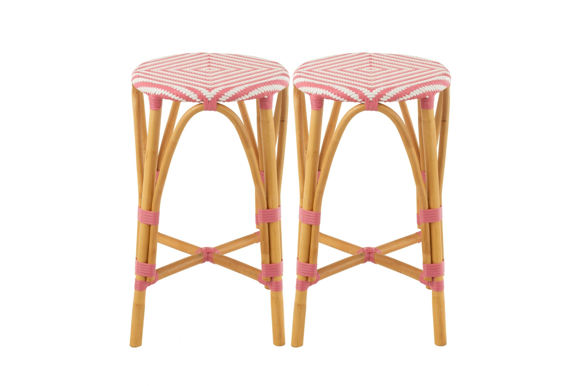 Duo de tabourets de bar sans dossier au style parisien, avec assise ronde tressée et structure en rotin naturel, adaptés à l’intérieur comme à l’extérieur.