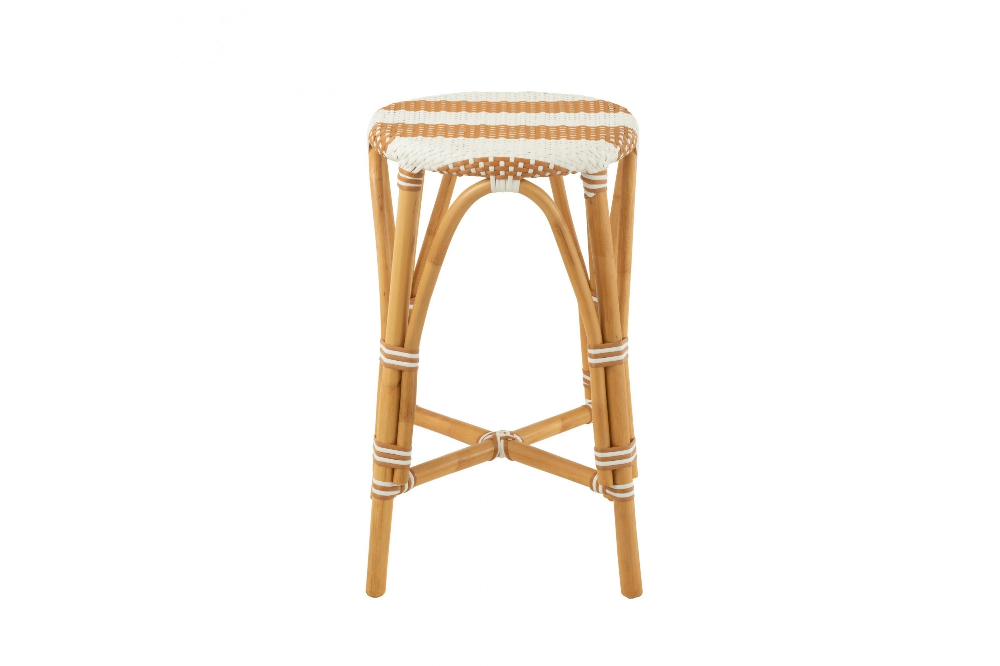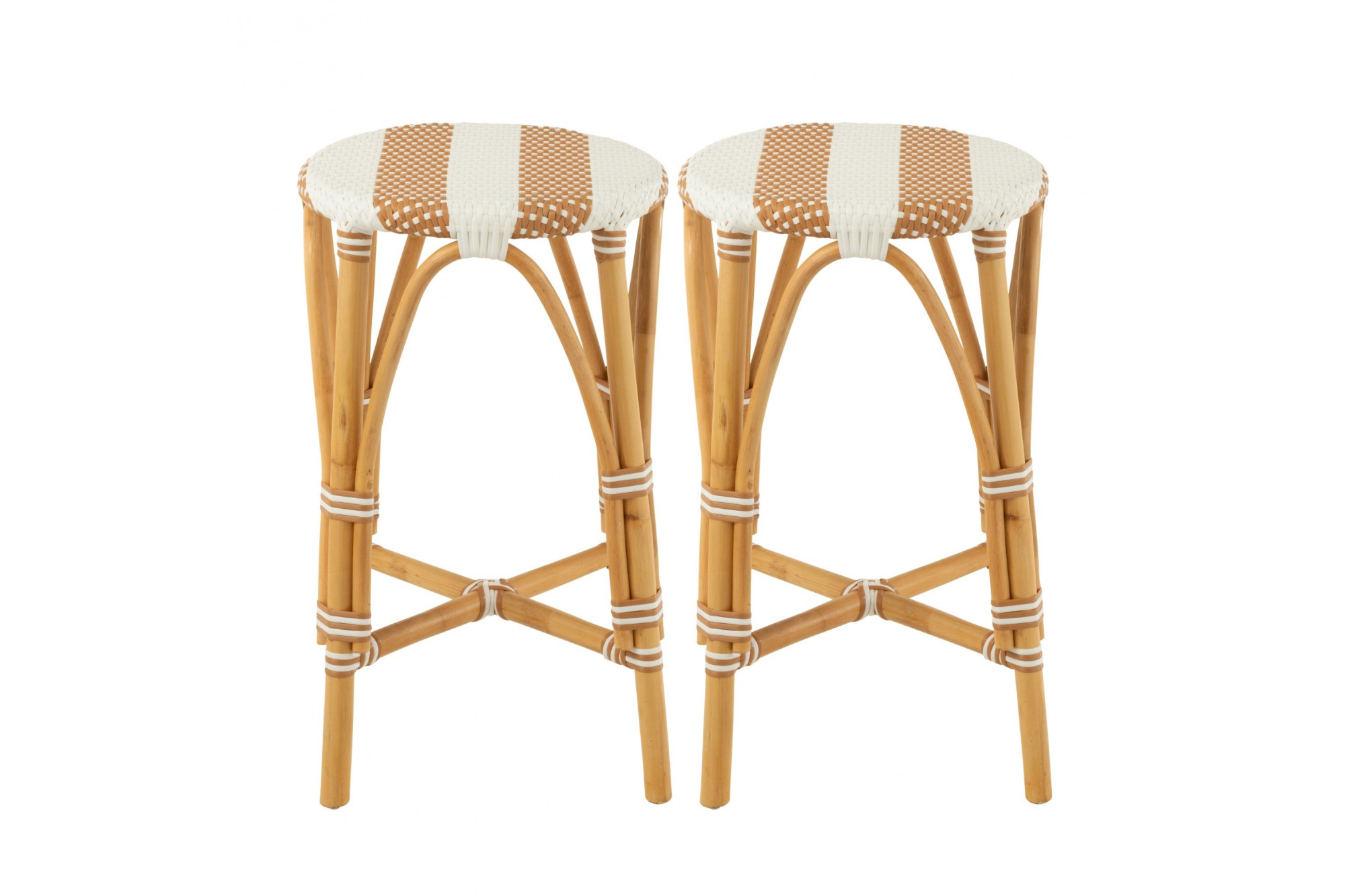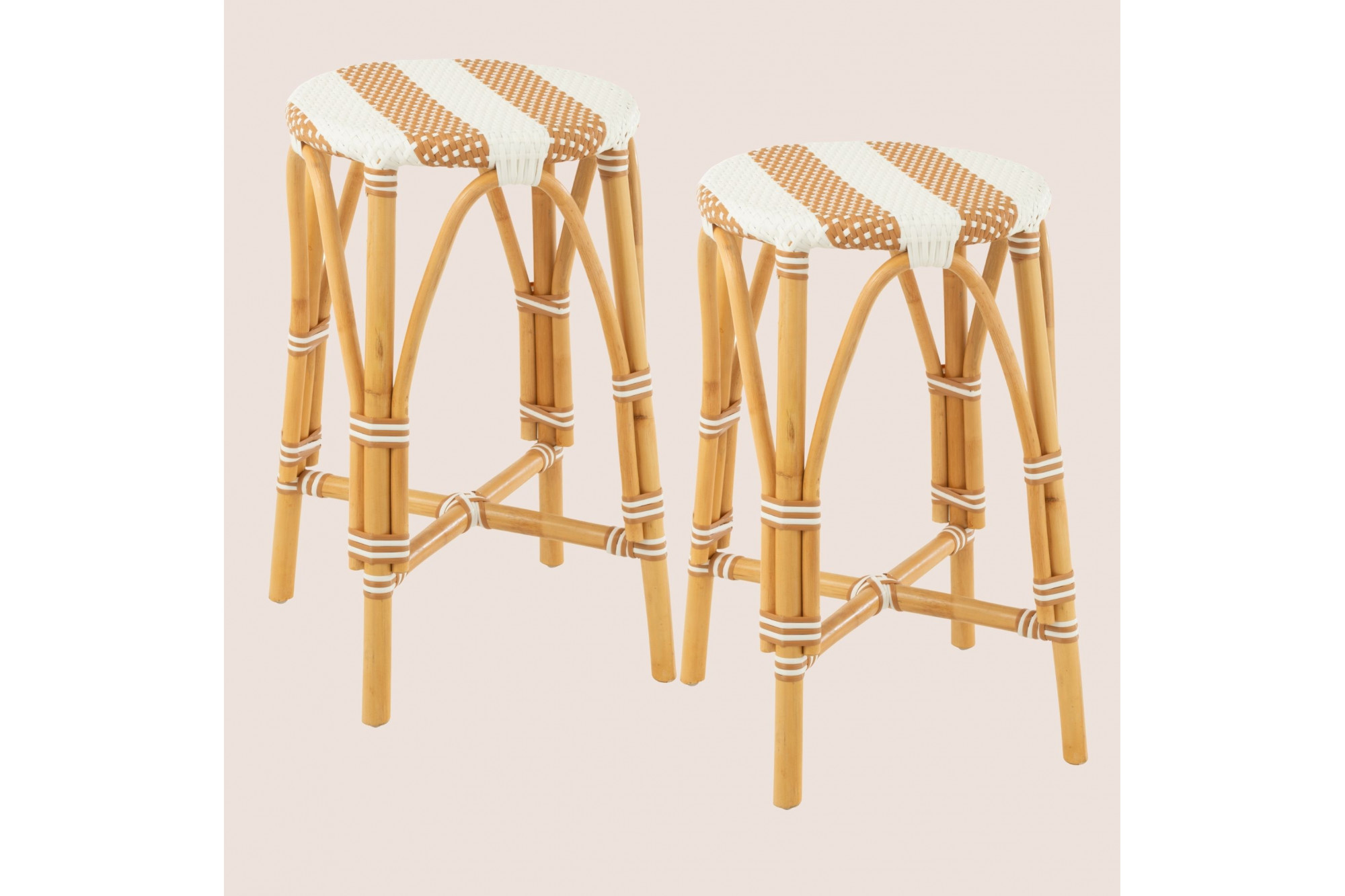 Tabourets de bar sans dossier au style parisien, avec assise ronde tressée et structure en rotin naturel, adaptés à l’intérieur comme à l’extérieur.