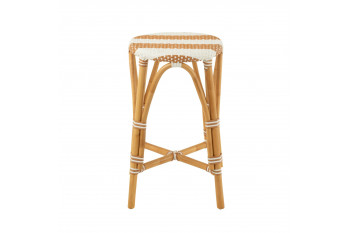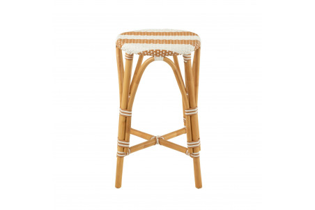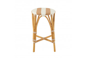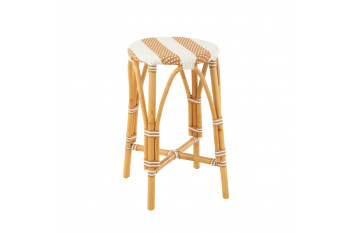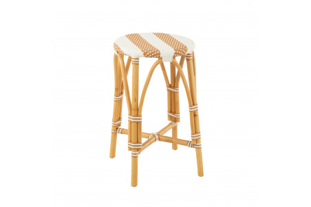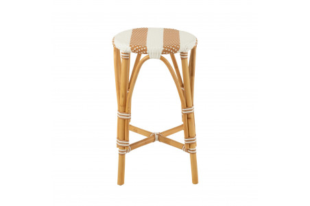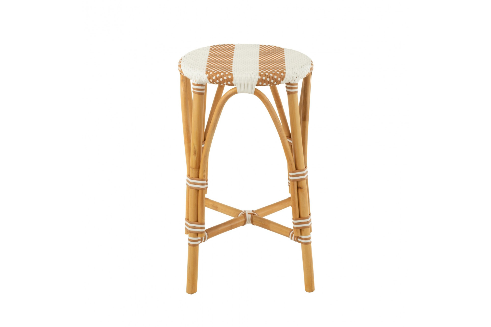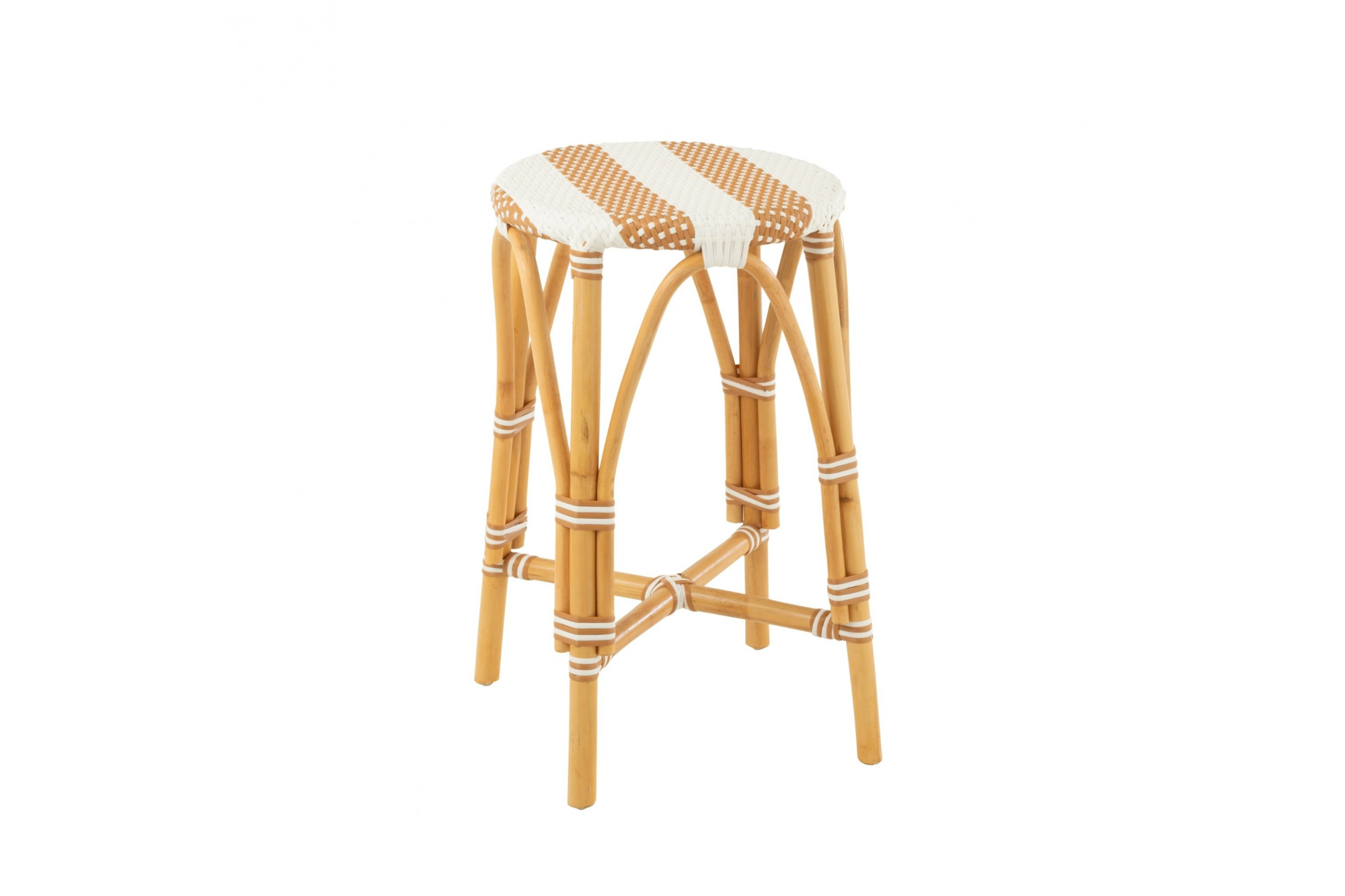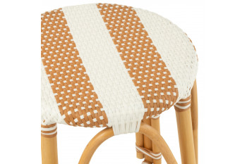 Tabourets de bar sans dossier au style parisien, avec assise ronde tressée et structure en rotin naturel, adaptés à l’intérieur comme à l’extérieur.